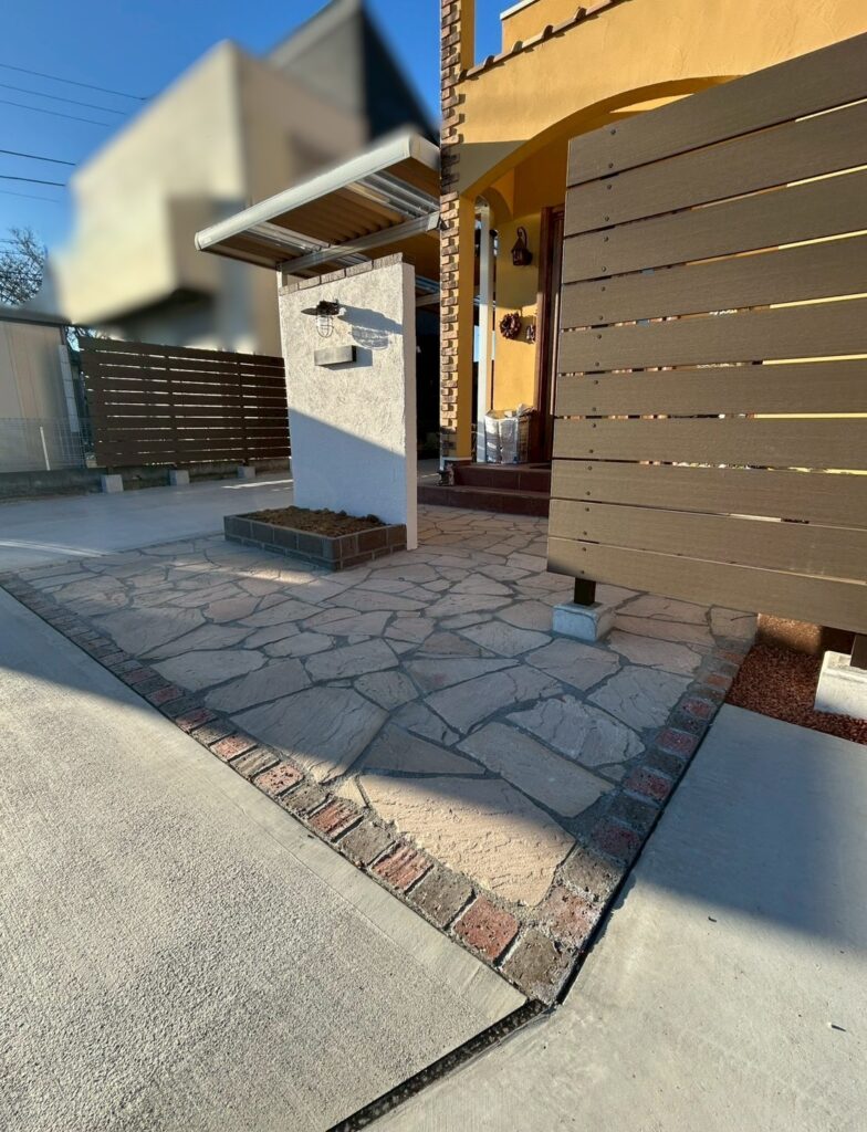 玄関前アプローチはSBIC ラジャスターン乱形 Mベージュです