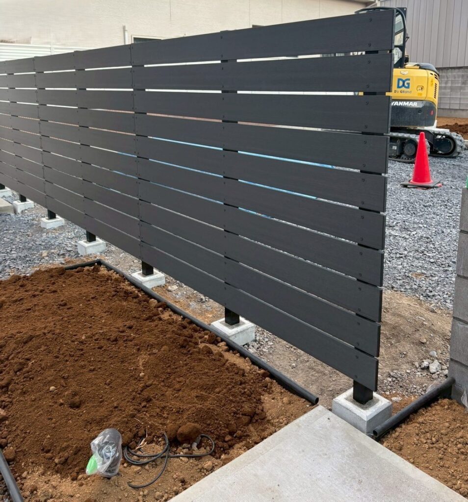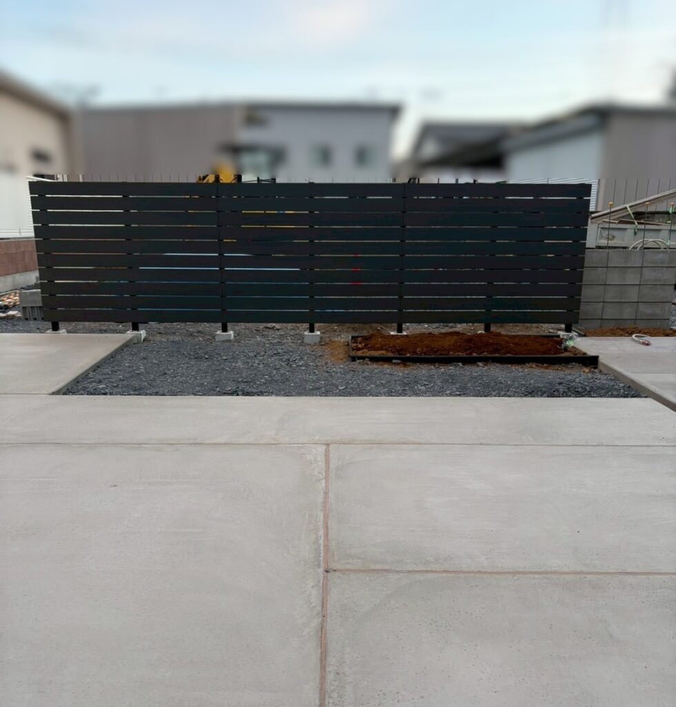 駐車場土間側からお庭への目隠しとして F&F ニコボードを施工しました 色は新色のダークです 新色人気です