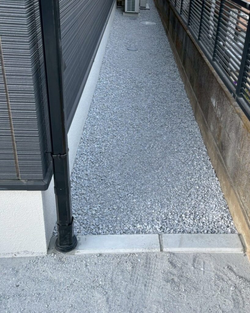 ★タイルデッキ前のお庭は人工芝を敷きます 母屋回りは防草シートを敷いて白ビリを施工しました