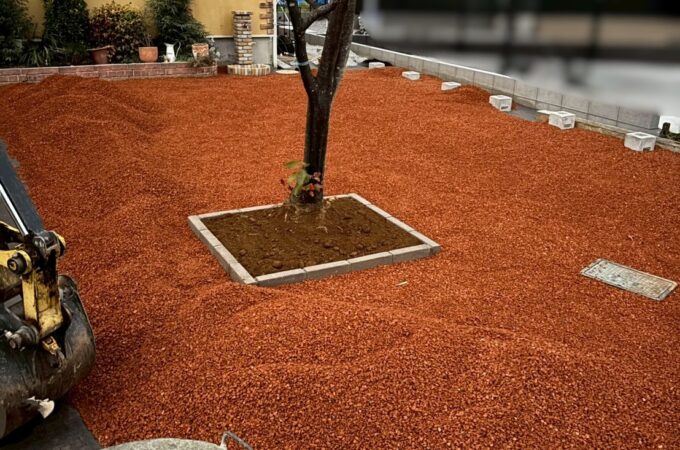 レンガチップ タイルデッキ ★お庭はレンガチップを敷きました 既存の木のま...