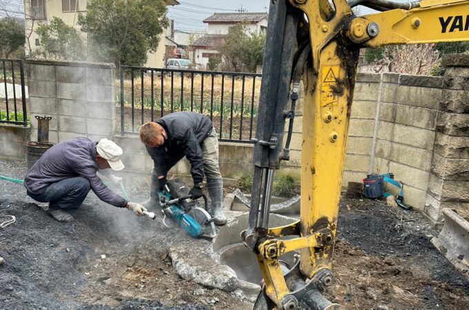 井戸側撤去・埋設工事の現場の様子です! 道具と重機で撤去作業 水をかけながら切断します ...